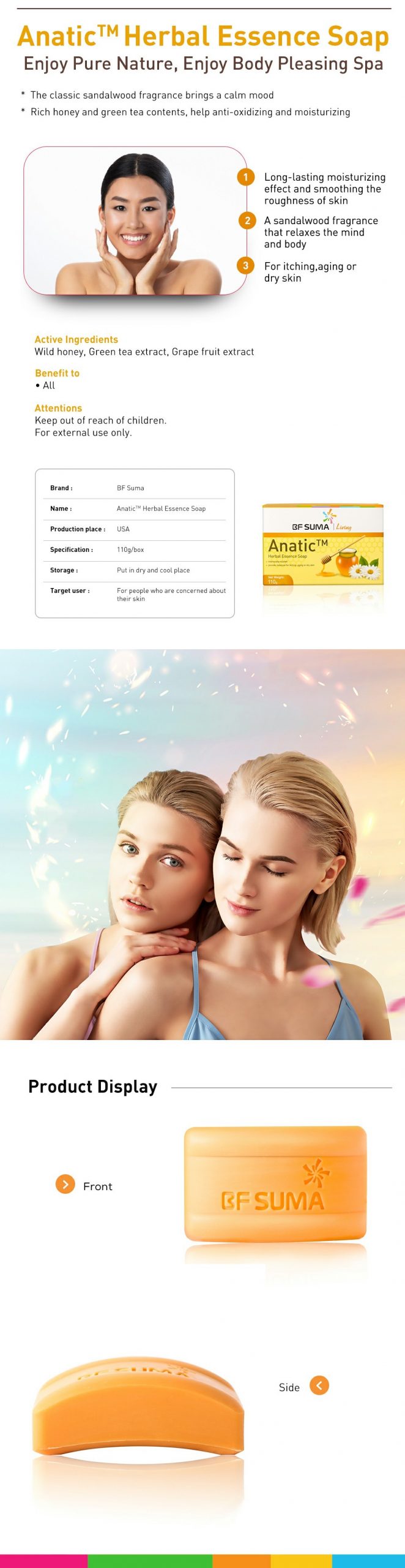 Formulated with wild honey, green tea extract, virgin olive oil, sandal wood and grapefruit extract, BF Suma Anatic Herbal Essence Soap with good smell can efficiently moisturize and smooth your skin.
